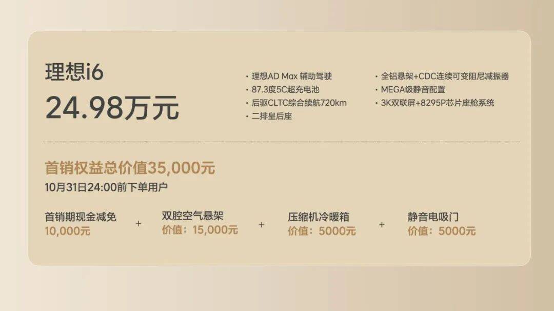 当然理想这次还是清醒的,全系只提供一款车型,售价24.98万元,在首销期提供1万元现金减免,赠送双腔空悬、冷暖箱和电吸门,后排娱乐屏、铂金音响、四驱为选装配置,部分颜色与更大轮毂同样选装。