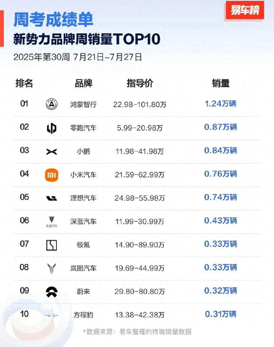 发布了周销量(2025年第30周)榜单前十名。鸿蒙智行以1.24万辆的成绩稳居销冠,其中最大的功臣当属问界M8,单周销量达到了5570辆,而更贵的问界M9表现同样不俗,单周2140辆排在全尺寸SUV第二。