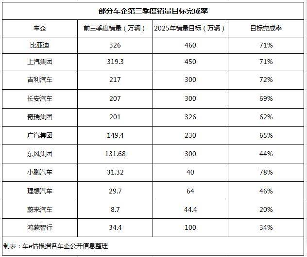 整体来看,头部车企优势凸显,多数新能源车企年度完成率不足50%,面临不小的冲刺压力,这也为四季度的市场竞争埋下伏笔。
