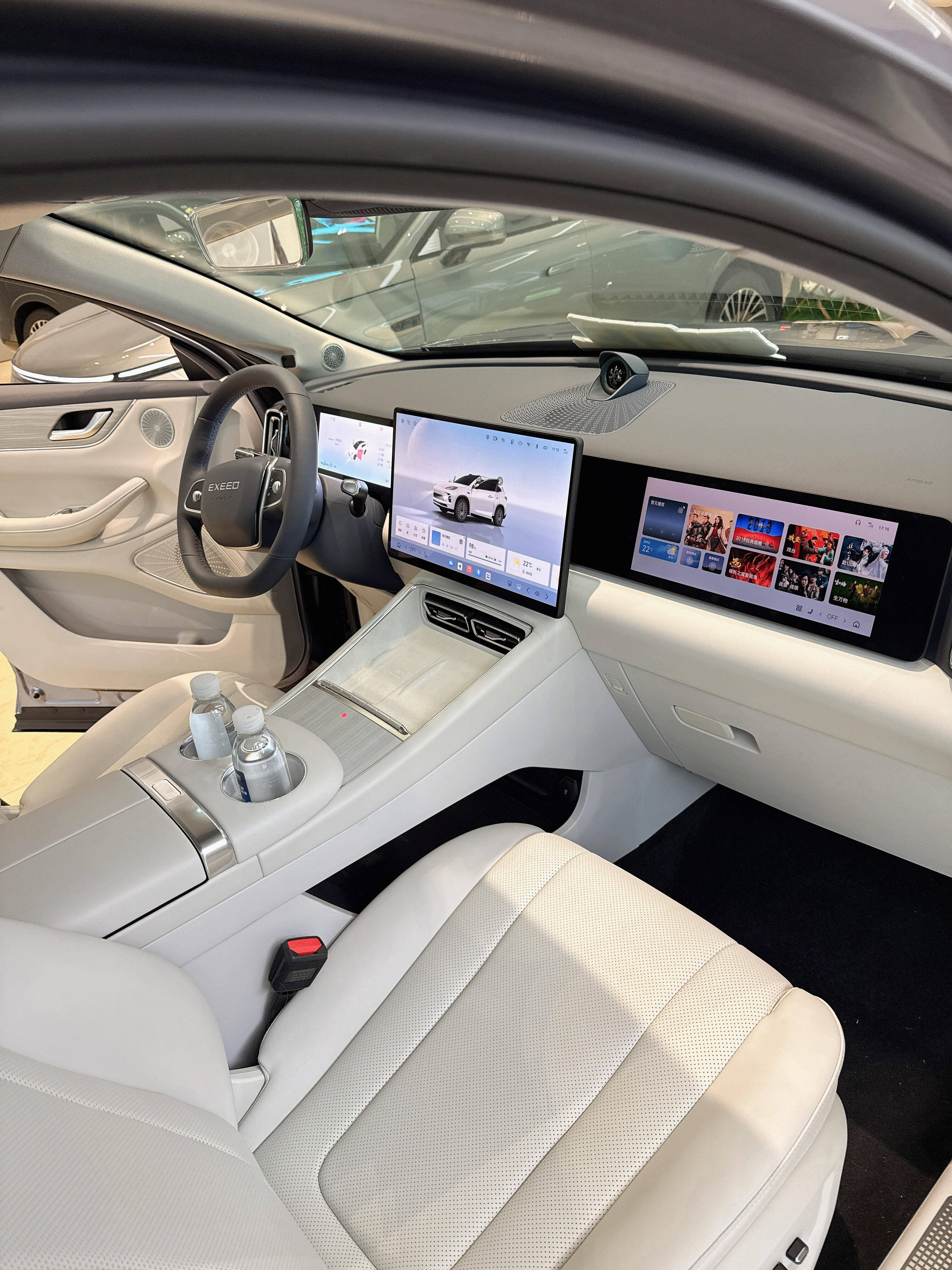 内饰将采用三联屏布局,以15.6英寸悬浮大屏为中心,左右两侧各内嵌10.25英寸液晶仪表、12.3英寸副驾娱乐屏,并搭载高通骁龙8255芯片加持的车机系统,支持科大讯飞+DeepSeek AI语音大模型。而白色风格配合大量皮质包覆、木纹饰板点缀,又营造出豪华气息,此外诸如双幅式多功能方向盘+电子怀挡、氛围灯+中置扬声器、一排镀铬物理按键的加持,也进一步提升了档次感。
