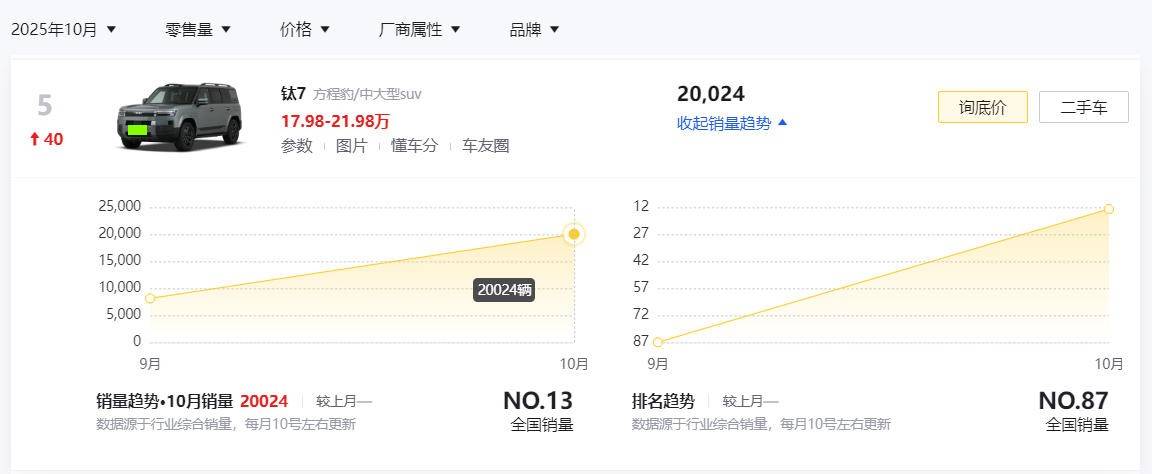 近日,10月份零售销量正式出炉,钛7以20024辆新车的销量数据,成为了方程豹品牌在售所有车型里表现最好的“选手”。同时,超过2万辆的月销量成绩,也让其坐稳了方盒子SUV市场销冠的位置,堪称真正的“大爆款”。