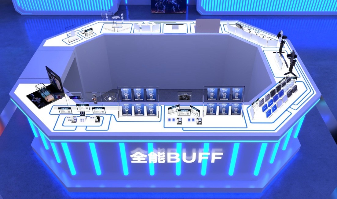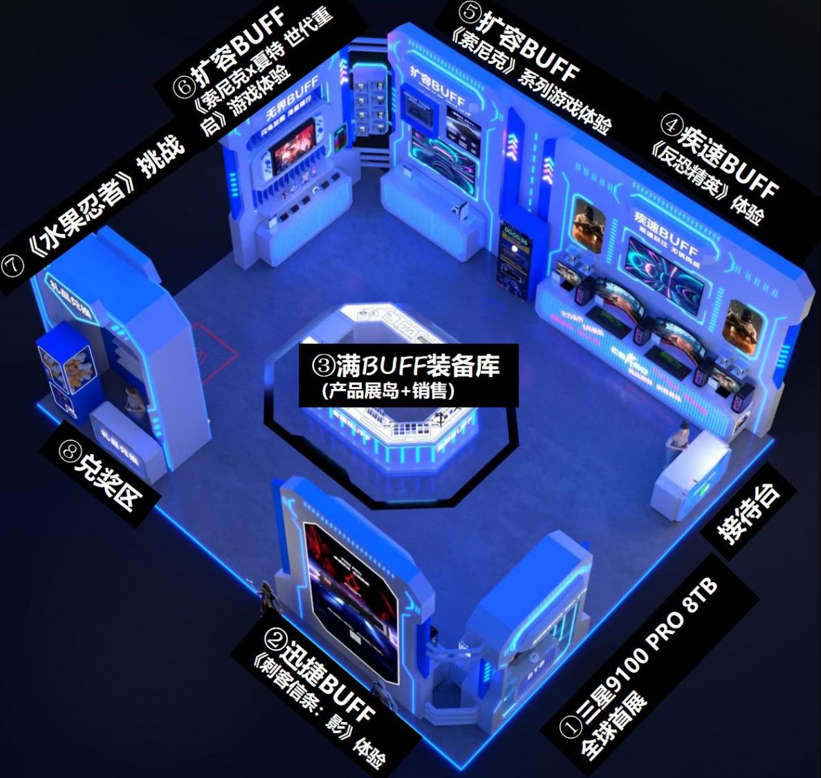 三星品牌存储展台位于上海国际博览中心E7展馆S101区域,以炫酷的蓝色线条勾勒出神秘的科技气息,非常显眼好找。展台延续了“满BUFF装备库”的主题,即以全能的存储产品,全方位满足用户的存储需求,并将存储最新科技与极致娱乐体验带给ChinaJoy所有玩家,内部设置各类“BUFF”体验区域等你来探索打卡。(下图为三星品牌存储展台3D效果展示)