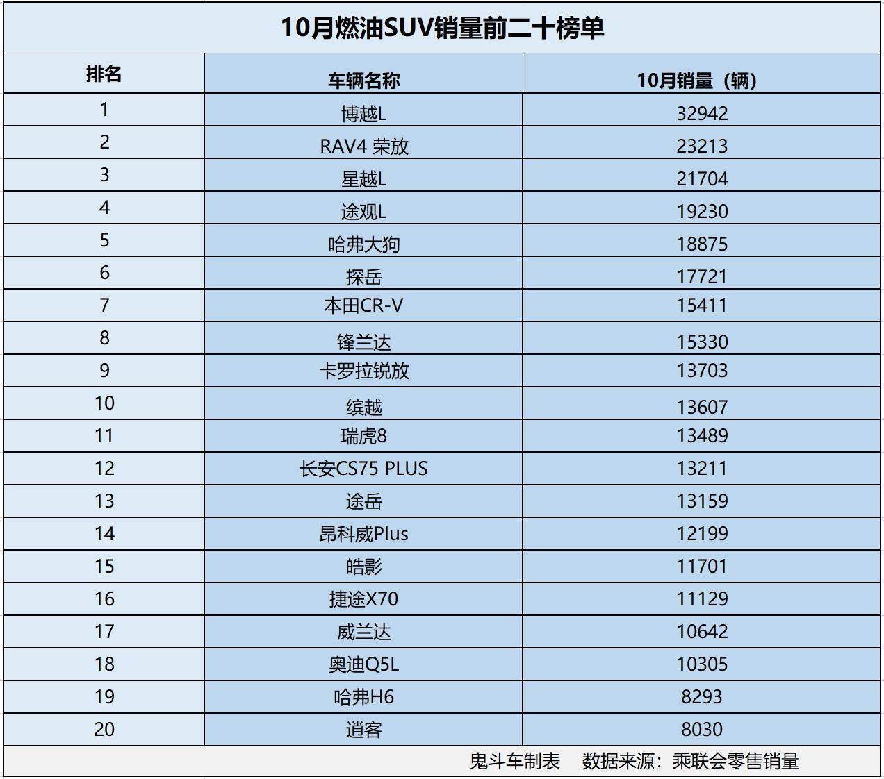 尤其是燃油SUV市场,卖得好的燃油SUV并不少。为了让网友们看得更清楚,鬼哥根据乘联会零售销量数据整理出,10月燃油SUV销量排名前二十榜单,结果发现,榜单上,共有18款燃油SUV销量过万。接下来,看看车型具体排名?