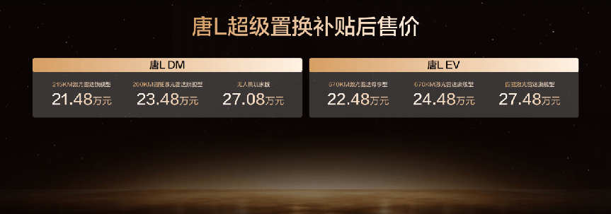 再看唐L EV系列,入门款670KM激光雷达尊享型(补贴后22.48万元)聚焦核心需求,670km的续航里程足以覆盖绝大多数用户的日常使用,全域千伏架构带来的快速补能能力是其最大亮点。虽然是纯电入门款,但激光雷达、DiLink 150智能座舱等核心配置并未缺席,保证了基础的智能体验。