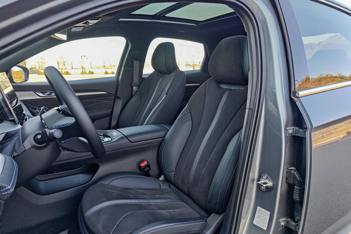 星瑞·东方曜标配14.6英寸中控屏+12.3英寸液晶仪表的组合,搭载了最新的FlymeAuto系统;此外试驾的顶配版本还配备了车载香氛、10扬声器Infinity音响、以及变道辅助、盲区监测等功能。