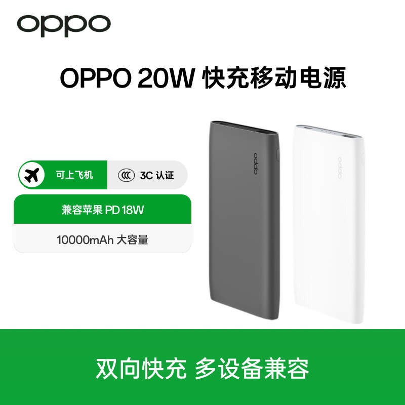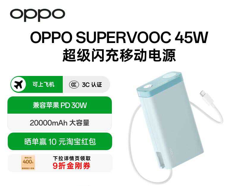 OPPO SUPERVOOC 45W 超级闪充移动电源搭载 20000mAh 大容量锂聚合物电池,兼容 3C 认证标准,可轻松携带上飞机。除USB-C自带线外,还配备1C1A两个双向快充接口,不仅支持 45W SuperVOOC 超级闪充技术,还兼容 PD、QC 等主流快充标准,可同时为笔记本、平板等设备高效供电。内置 LED 应急灯可满足夜间照明需求。