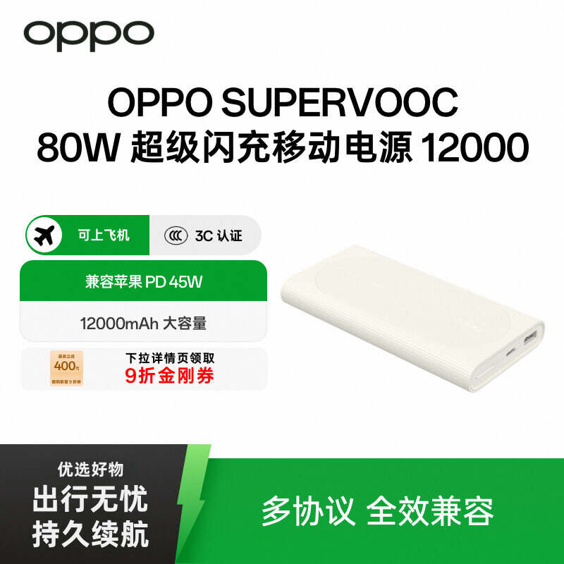 OPPO SUPERVOOC 80W 超级闪充移动电源搭载 12000mAh 大容量锂聚合物电池,配备 USB-C 和 USB-A 双接口,单口输出时可实现 80W 超级闪充,支持双向快充技术,输入功率最高 45W。此外还支持PD3.0、QC3.0、AFC、FCP 等主流快充协议,电源键集成 LED 灯带电量显示,三击可进入小电流模式,专为智能手表、耳机等小功率设备稳定供电。
