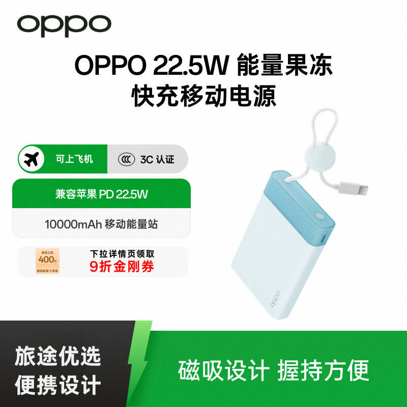OPPO 22.5W 能量果冻快充移动电源设计主打年轻化与便携性,采用独特的半透明果冻机顶与海盐色系外壳,搭配磁吸附式挂载结构,重量轻巧且造型时尚。内置10000mAh高密度锂电,支持22.5W输出与18W自充,配备自带USB-C充电线,实现“一拉即充”;同时提供额外的USB-C接口,兼容手机、耳机等多设备快充。支持双击切换小电流模式,可为智能手表、耳机等小功率设备安全供电。