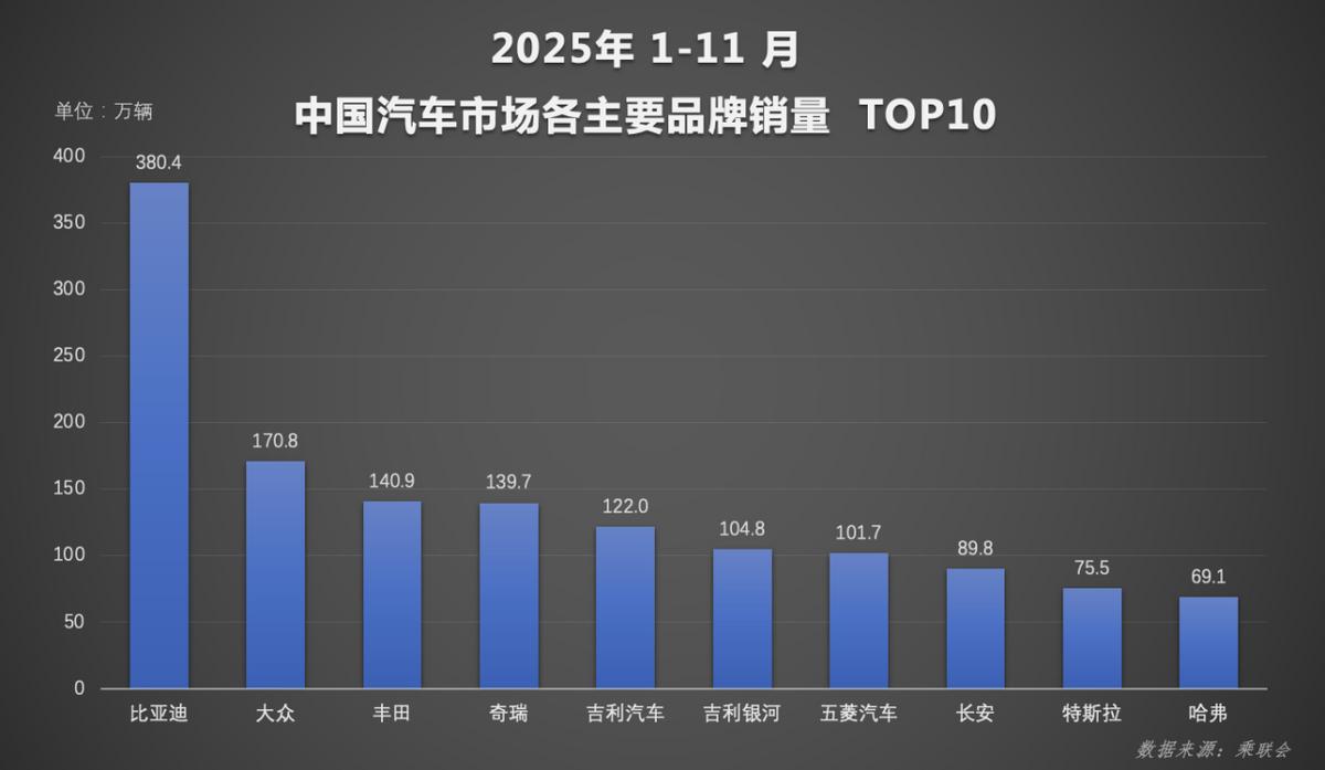 从累计数据看,2025年前11个月比亚迪累计销量418.2万辆,同比增长11.3%,年度销量目标完成率超九成。随着12月市场进入冲刺阶段,比亚迪有望超额完成全年目标。