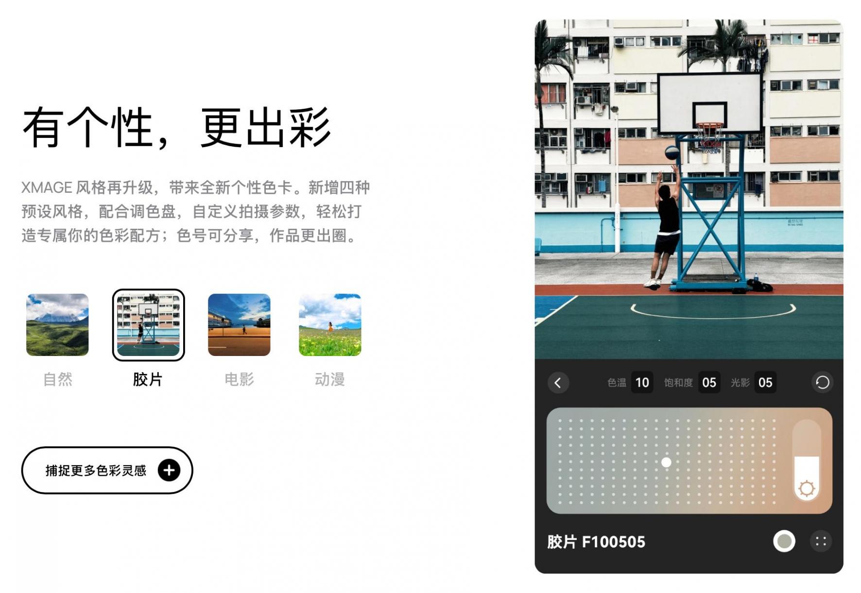 还有XMAGE风格个性色卡,新增胶片、电影、动漫等多种个性风格。无论你钟情复古温润的胶片风,热爱日系清新的动漫质感,还是色调对比强烈的电影风,都可以自定义调节色彩风格并进行个性化命名,保存为自己的专属色号,解锁你眼中独特的色彩风格。还可以随心分享给好友,复刻同款色号,一起拍出百变风格大片。