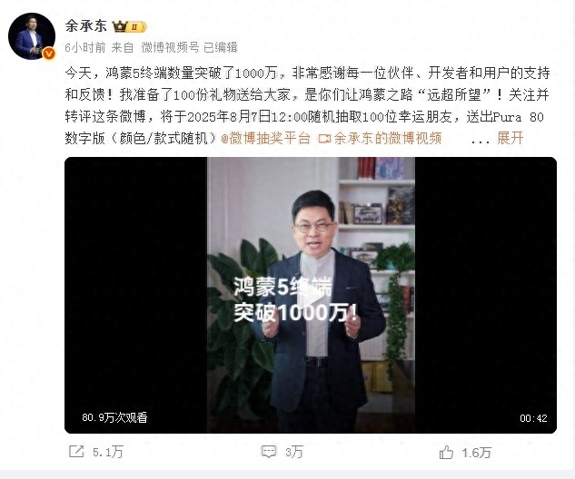 7月30日上午,华为常务董事、终端BG董事长余承东在微博宣布:“今天,鸿蒙5终端数量突破了1000万,非常感谢每一位伙伴、开发者和用户的支持和反馈” 标志着鸿蒙生态从“破冰扎根”迈向“连片盛放”的关键跨越。