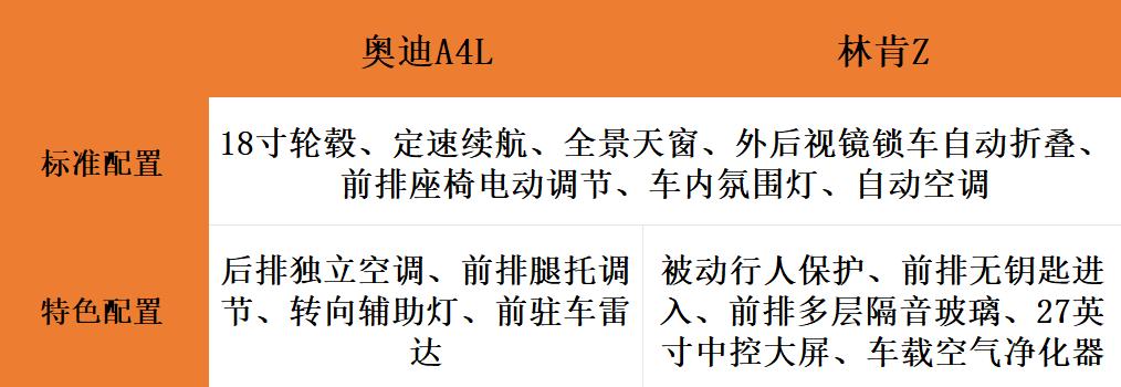 奥迪A4L多出了后排独立空调、前排腿托调节、转向辅助灯、前驻车雷达等配置,轮胎尺寸也加宽到了245mm(林肯Z是235mm),反观林肯Z所配备的被动行人保护、前排无钥匙进入、前排多层隔音玻璃、27英寸中控大屏和车载空气净化器等功能则是奥迪A4L所没有的。