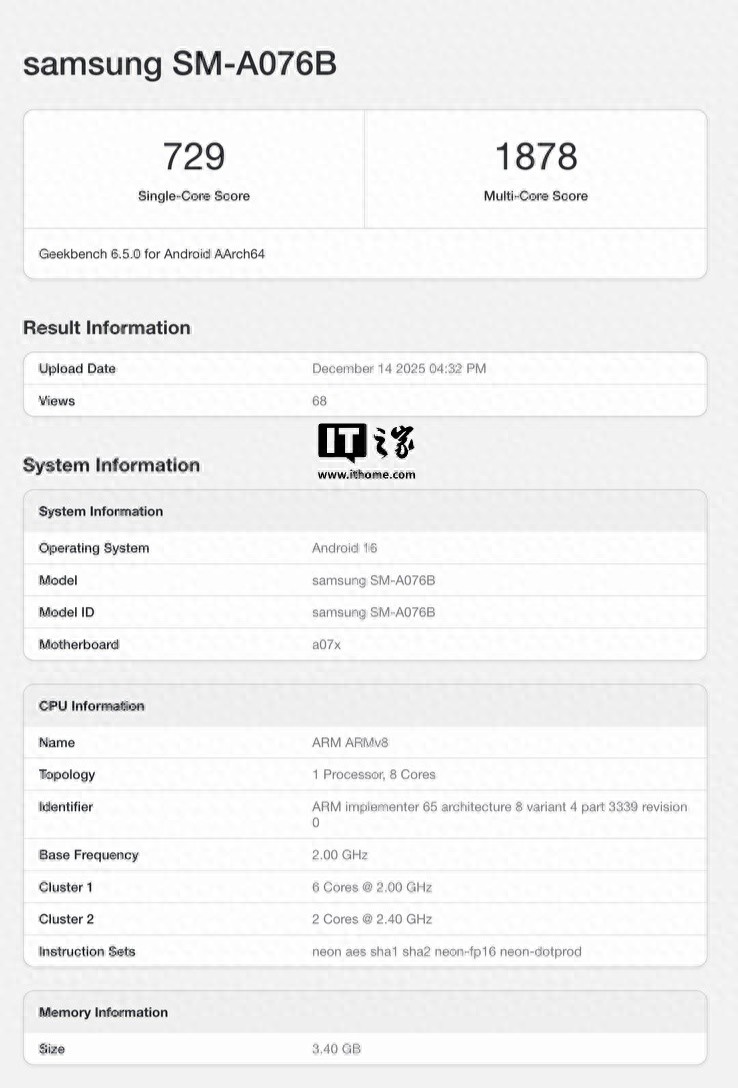12 月 17 日消息,科技媒体 Notebook Check 昨日(12 月 16 日)发布博文,报道称型号为 SM-A076B 的手机现身 GeekBench 跑分库,基于三星命名规则,该机上市后名为 Galaxy A07 5G,将会是三星最便宜的 5G 手机。
