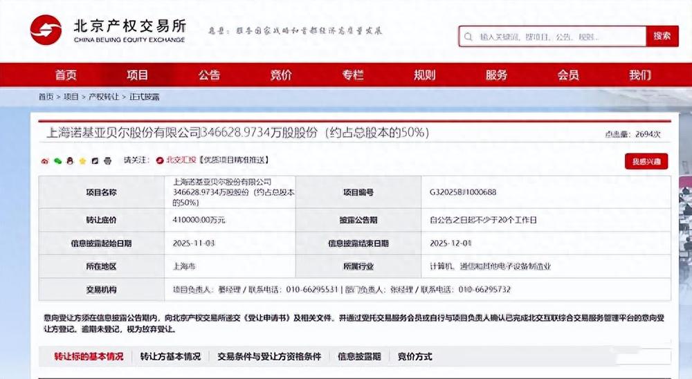 11月3日,北京产权交易所官网挂出诺基亚贝尔股权转让信息,华信邮电拟出让其持有的346628.9734万股股份,占公司总股本的50%,转让底价41亿元。