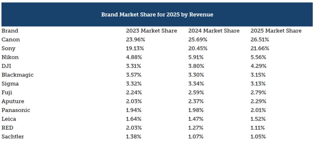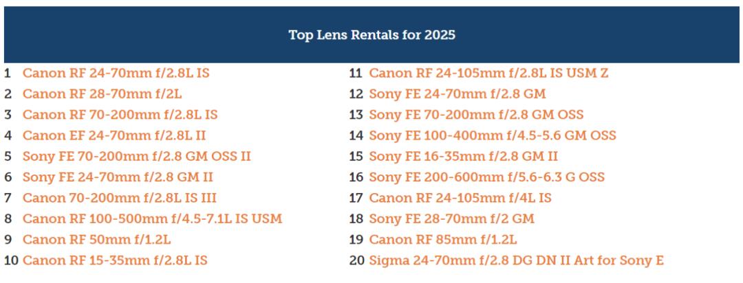 2025年12月17日,美国摄影器材租赁商Lensrentals公布了《2025年最受欢迎摄影器材租赁榜》,同时还公布了各厂商的份额,两者均是基于Lensrentals上的实际租赁数据得出,今年最热门的租赁单品是佳能的RF 24-70mm F2.8L IS镜头,而品牌份额方面,佳能则是以26.51%排名第一,索尼以21.66%紧随其后,第三名的尼康份额为5.56%,与大疆的份额差距越来越小了。