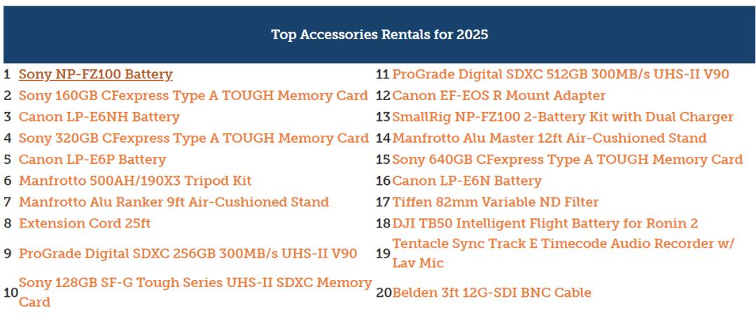 配件榜基本涵盖了线缆到硬盘、三脚架,乃至灯光设备等,最受欢迎的配件是索尼NP-FZ100 电池。