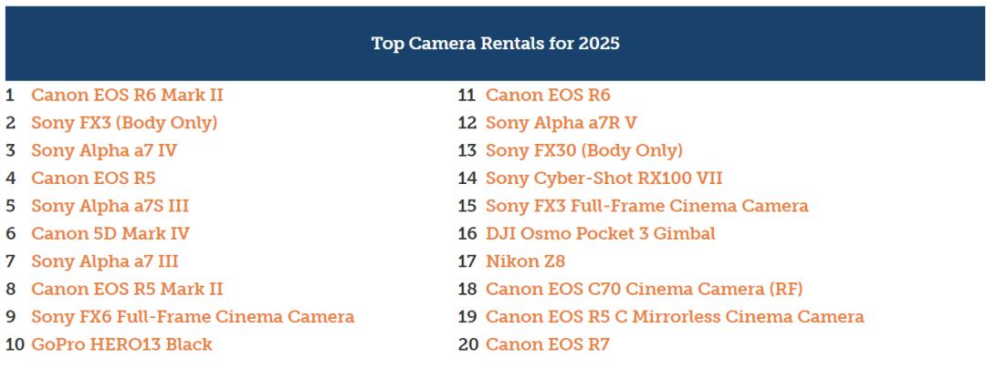 2025年热门相机租赁榜可以说是佳能和索尼平分天下,前者占了8个名额,而后者占了9个名额。前三名分别是佳能EOS R6 Mark II、索尼 FX3(仅机身)和索尼 Alpha a7 IV。