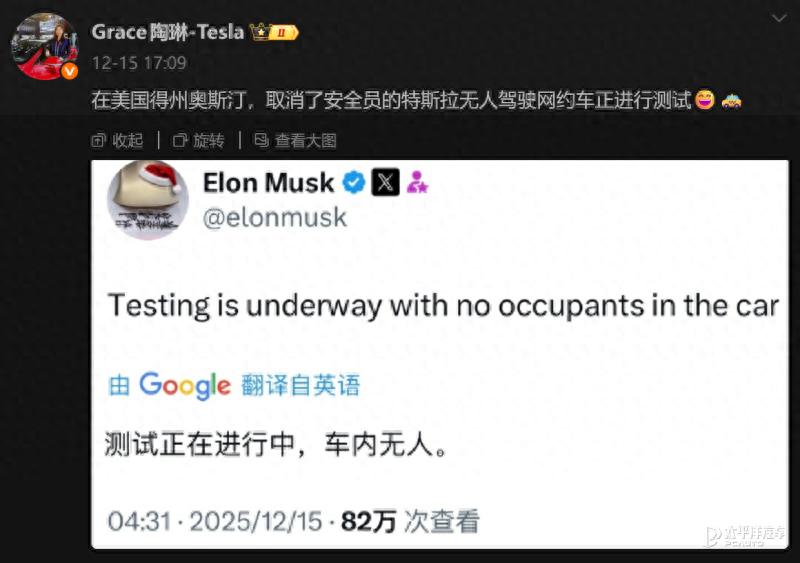 近日,特斯拉公司副总裁陶琳通过社交媒体确认,在美国得州奥斯汀,取消安全员的特斯拉无人驾驶网约车正在进行实际道路测试。