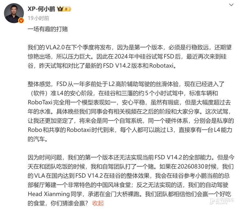 小鹏汽车董事长何小鹏作为行业同行,在近期实际体验后评价道,FSD已从一年前“L2高阶辅助驾驶的丝滑体验”,进入“软件准L4的安心阶段”。