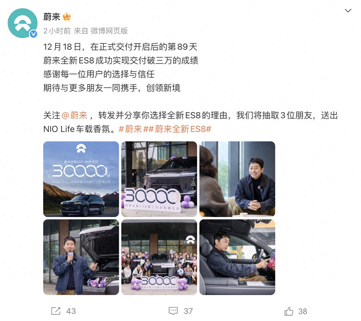 12 月 18 日,蔚来官方宣布全新 ES8 达成第 30000 台交付,从交付开启到这一里程碑仅用时 89 天,创下 40 万元以上纯电车型交付破三万的最快纪录。更值得关注的是,其从 2 万台到 3 万台的交付仅耗时 19 天,增速持续领跑高端纯电市场。