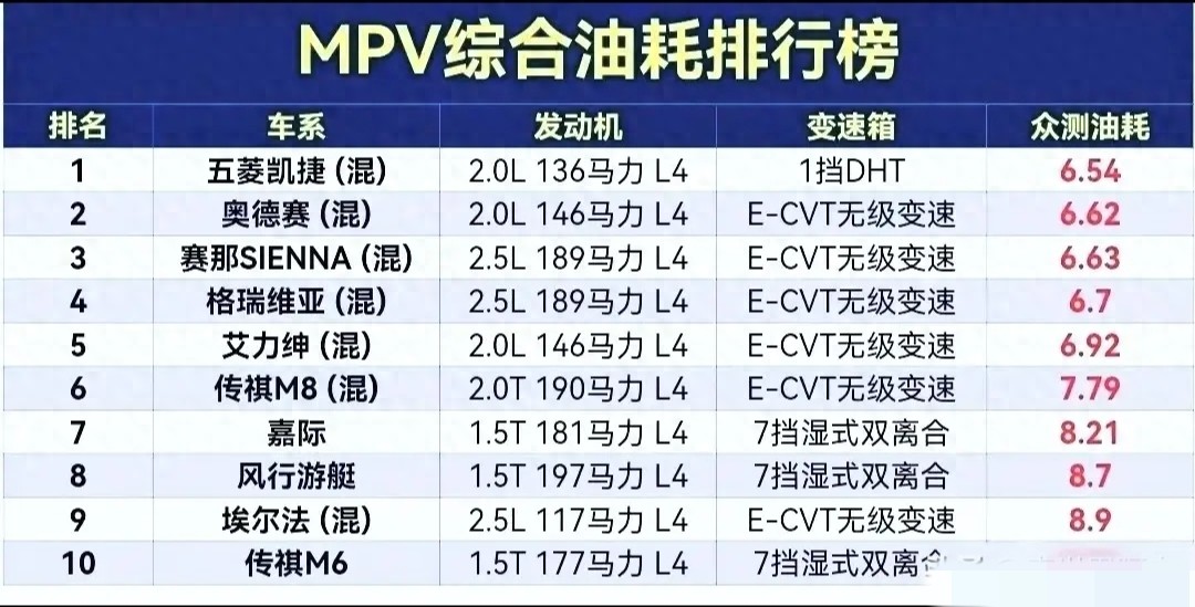 MPV可不都是油老虎啊!当前汽车市场中MPV车型因其空间实用性和舒适性受到越来越多家庭及商务用户的关注,而油耗表现也成为消费者选车时的重要考量依据。从MPV综合油耗排行榜中可以看出,混合动力车型在能效方面优势明显。五菱凯捷混动版以6.54L的众测油耗位列第一,紧随其后的是奥德赛混动版和赛那SIENNA混动版,油耗分别为6.62L和6.63L,格瑞维亚混动版和艾力绅混动版也表现不俗,油耗控制在7L以内,分别为6.7L和6.92L。传祺M8混动版以7.79L的成绩位列第六,依然优于多数燃油车型。