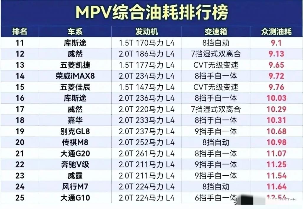 嘉际、风行游艇等紧凑型MPV油耗分别为8.21L和8.7L,而传祺M6与丰田埃尔法混动版同为8.9L,但埃尔法作为大型MPV采用混动系统仍未能进入低油耗第一梯队,说明车身尺寸和整备质量对油耗存在直接影响。库斯途1.5T版本油耗为9.1L,大众威然低功率版为9.13L,表现相对可控;五菱凯捷燃油版、荣威iMAX8及五菱佳辰的油耗在9.65L至9.76L之间,仍保持在10L以下,属于同级别中较为节油的车型。