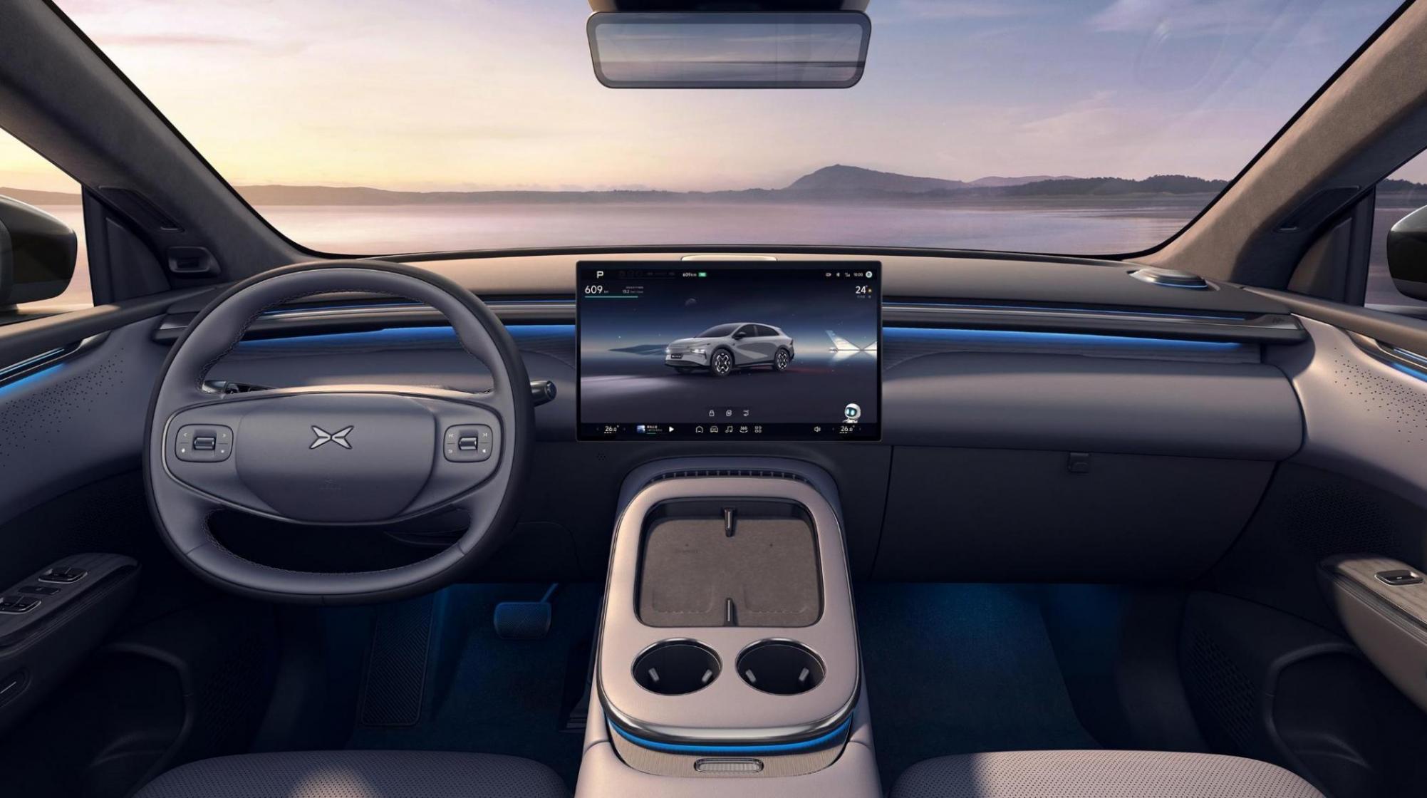 小鹏G7的内饰设计简洁,并且两侧与门板相连的位置有一定环抱感,中控为一块15.6英寸2.5K屏,內置8295P芯片,方向盘前方的传统仪表被87英寸AR-HUD替代。后排还有一块8英寸液晶屏幕,还配有带磁吸功能的折叠小桌板。