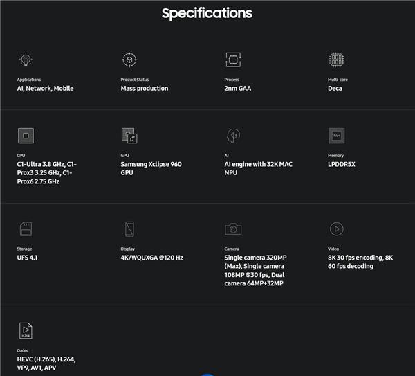 ISP方面,Exynos 2600支持最高320MP单摄、108MP@30fps单摄、64MP+32MP双摄;支持DVNR、APV codec;视频能力支持8K 30fps编码,8K 60fps解码;支持HEVC(H.265)、H.264、VP9、AV1格式。