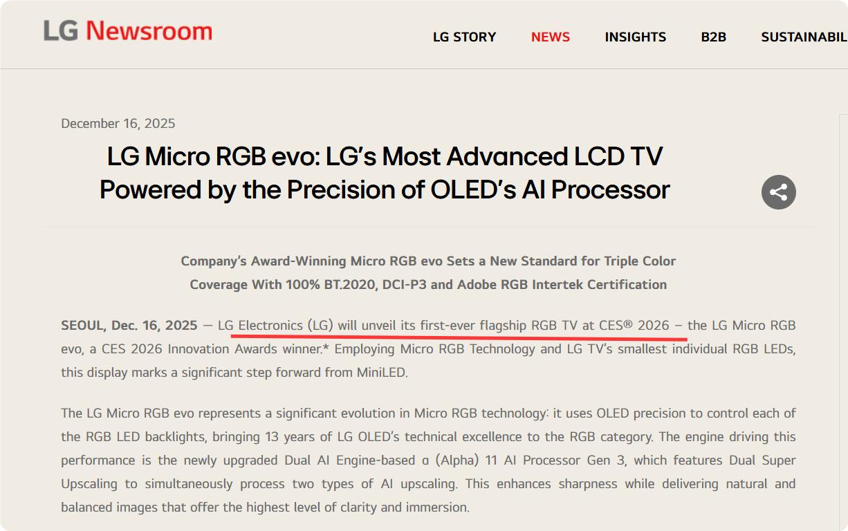 12月16日,LG宣布将在CES 2026上推出首款旗舰 Micro RGB 电视 LG Micro RGB evo(请参阅上图),定位为OLED技术的演进版,将十余年OLED开发经验应用于 RGB LED背光控制,实现更高精度。