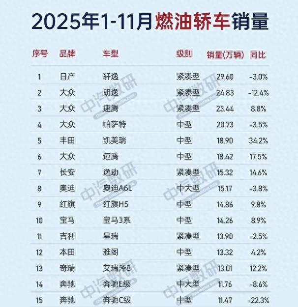 前两个月,新能源车超过燃油车,新能源的发展远超预期,而2026年开始新能源车不再享受免购置税,按车重缴纳消费税等,也在进行激烈讨论。未来新能源的增长趋势将放缓,但消费者对新能源的消费习惯已经养成。前11月个月,燃油轿车的销量如何?下图是1-11月燃油轿车TOP15榜单。