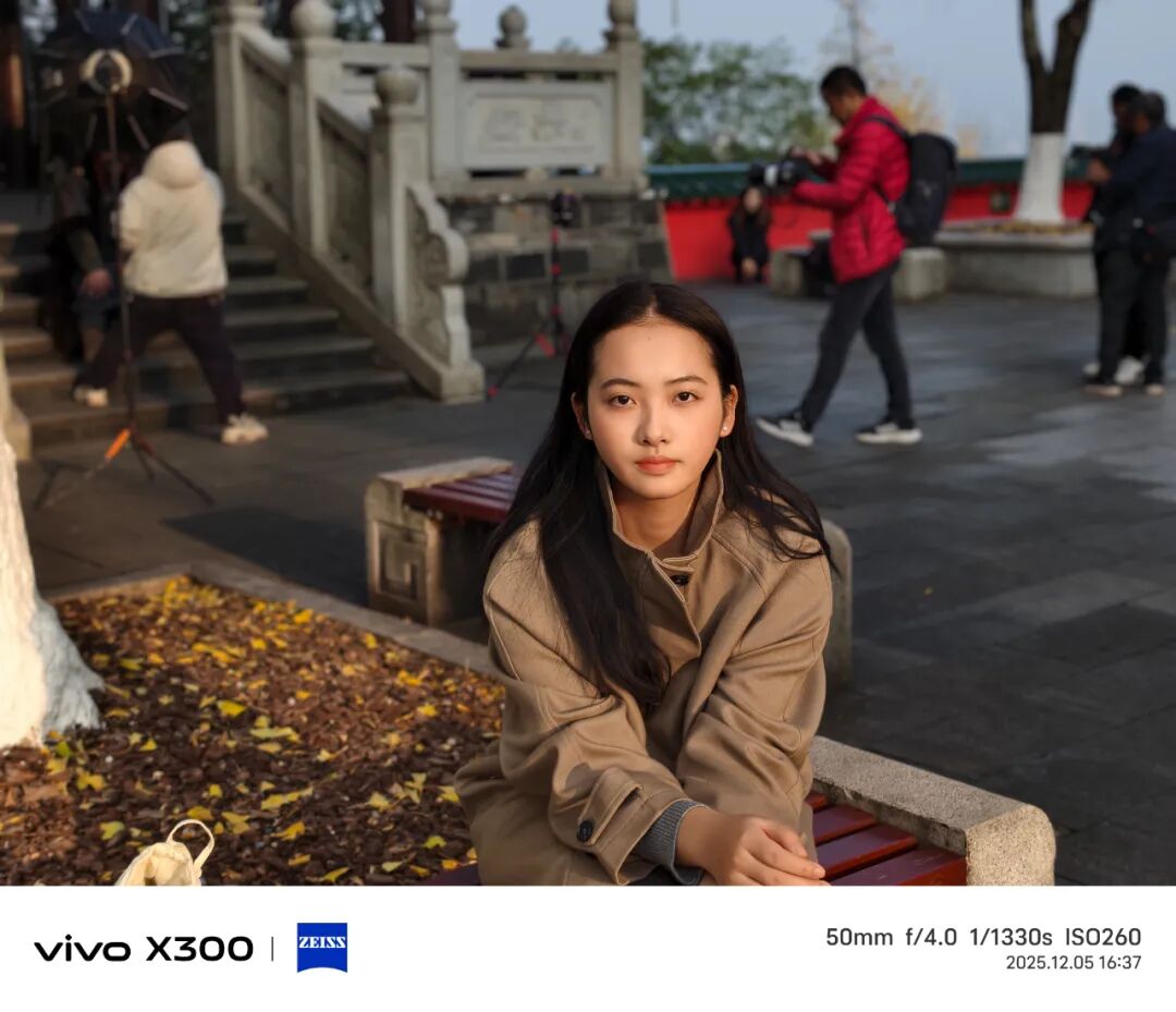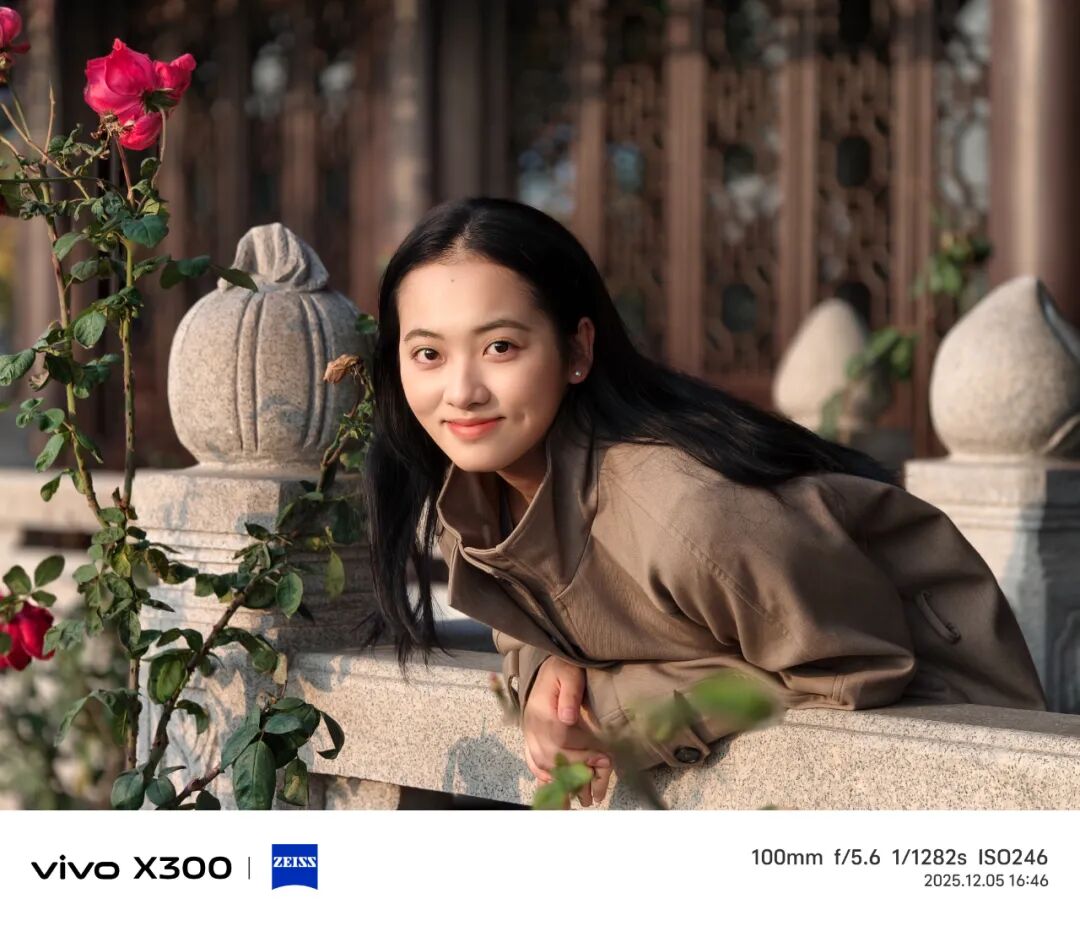 vivo X300人像模式仍然提供23mm、35mm、50mm、85mm和100mm共5个经典焦段。我很喜欢用85mm焦段,它能在突出人物的同时简单交代背景。样张中,侧逆光的光位让画面空间感和层次感增强,人物面部五官立体。美颜也没有简单粗暴的高斯模糊,而是保留了皮肤的肌理、头发和眉毛等处的毛流感,让照片更加真实和具有生活感。人像模式23mm焦段同样支持“2亿高像素”,这一模式下又衍生了“电影感三拼”“胶片风双拼”两个功能,简单说就是把一张高像素照片裁切成多个分镜,照片更具创意。
