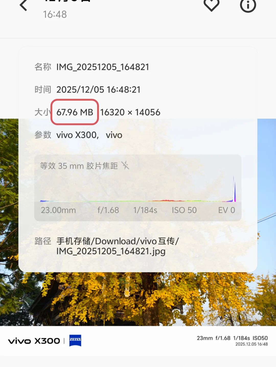 实际拍摄中,我将主摄默认焦段主要用于拍摄风景和静物等,从拍摄的样张来看,它们都呈现出清晰度高、色彩还原以及光影过渡自然等特点。站在高处俯瞰城市,摄像头能清晰捕捉画面,包括近处的植物、远处的建筑以及略带雾感的夕阳下的天空。23mm焦段拍摄时,可以选择“2亿高像素”模式,这一模式下拍摄的银杏树保留了很多肉眼难以观察到的细节,比如树枝的纹路、银杏叶的色彩变化等。并且这张照片分辨率高达16320×14056,对于后期裁切二次构图或是创意处理都更有利。