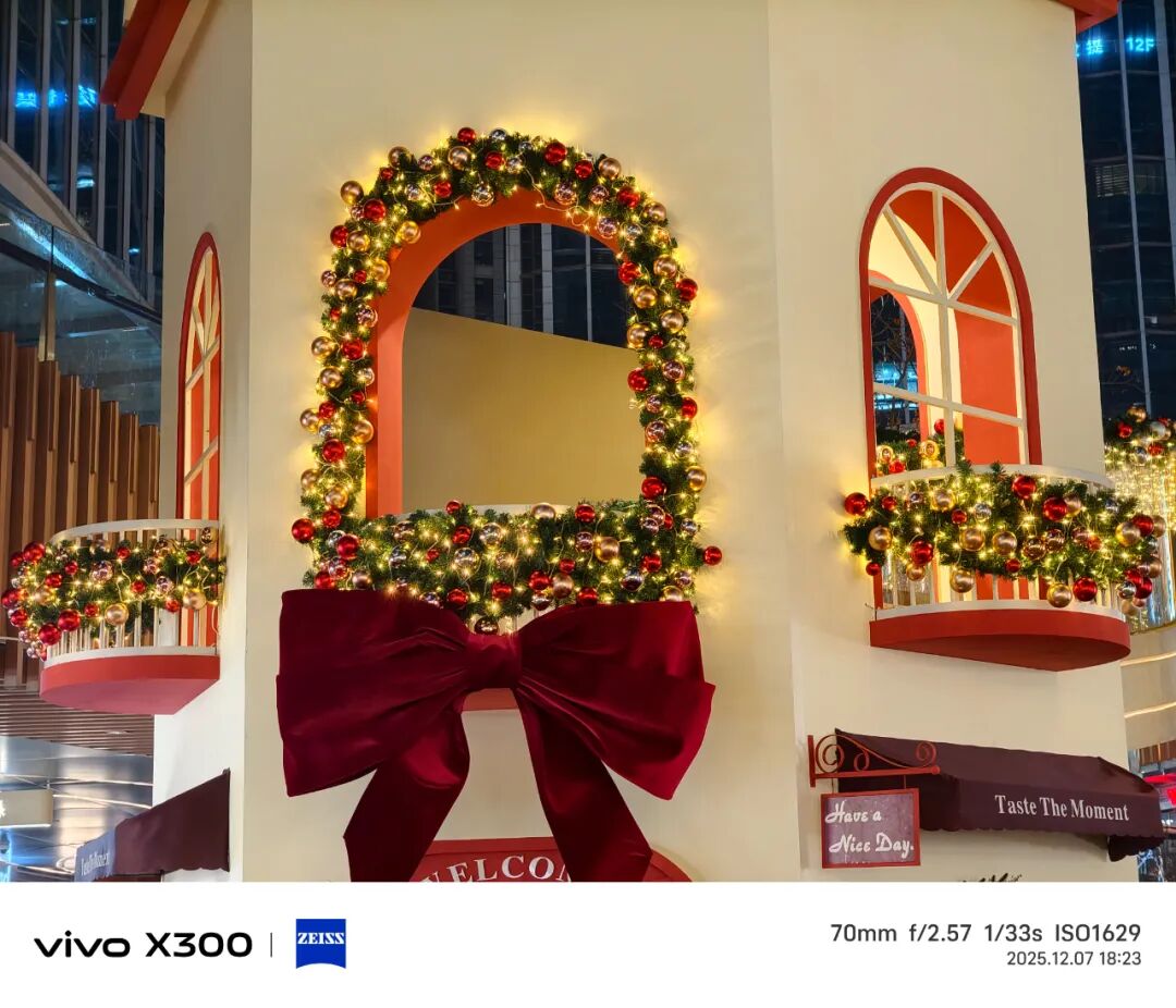 vivo X300长焦和广角的表现比较稳定。长焦方面它支持3X光学变焦和最大100X数码变焦。选用3X拍摄时,成片中远处圣诞装饰物鲜艳的色彩、细腻的光影过渡和植绒蝴蝶结柔软的质感等都被捕捉下来。增加到10X拍摄远处的小猫,放大图片都能看到其毛发与背景的清楚分隔。广角摄像头拍摄的照片已不必多说,成片清晰度、画面色彩表现和畸变程度都挑不出什么毛病,不管是日常拍摄还是专业领域的拍摄都能适用。