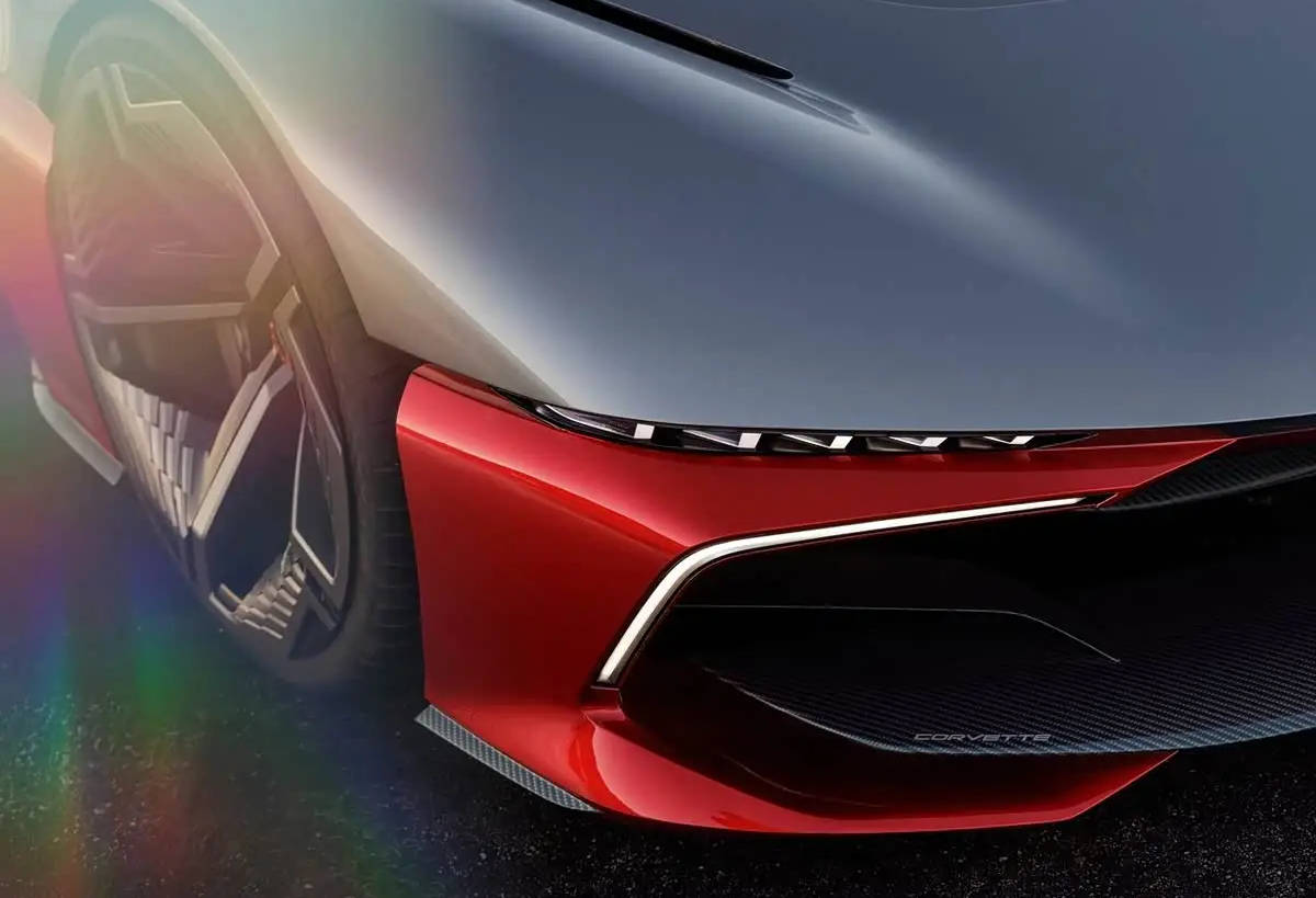 从外观设计来看,新车整体造型有着现代主义设计美学的特点,但又传承了科尔维特系列车型的线条。例如车头宽大的机舱面板,并搭配双段式的通风开口,其内部将车身连通,形成空气桥设计,车灯则融入在车体内部,两侧隆起的翼子板造型也展现出半开放式轮眉的设计理念。