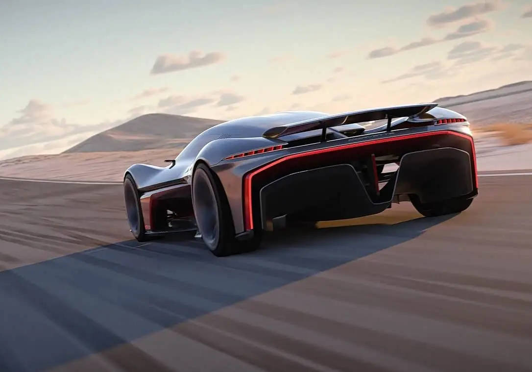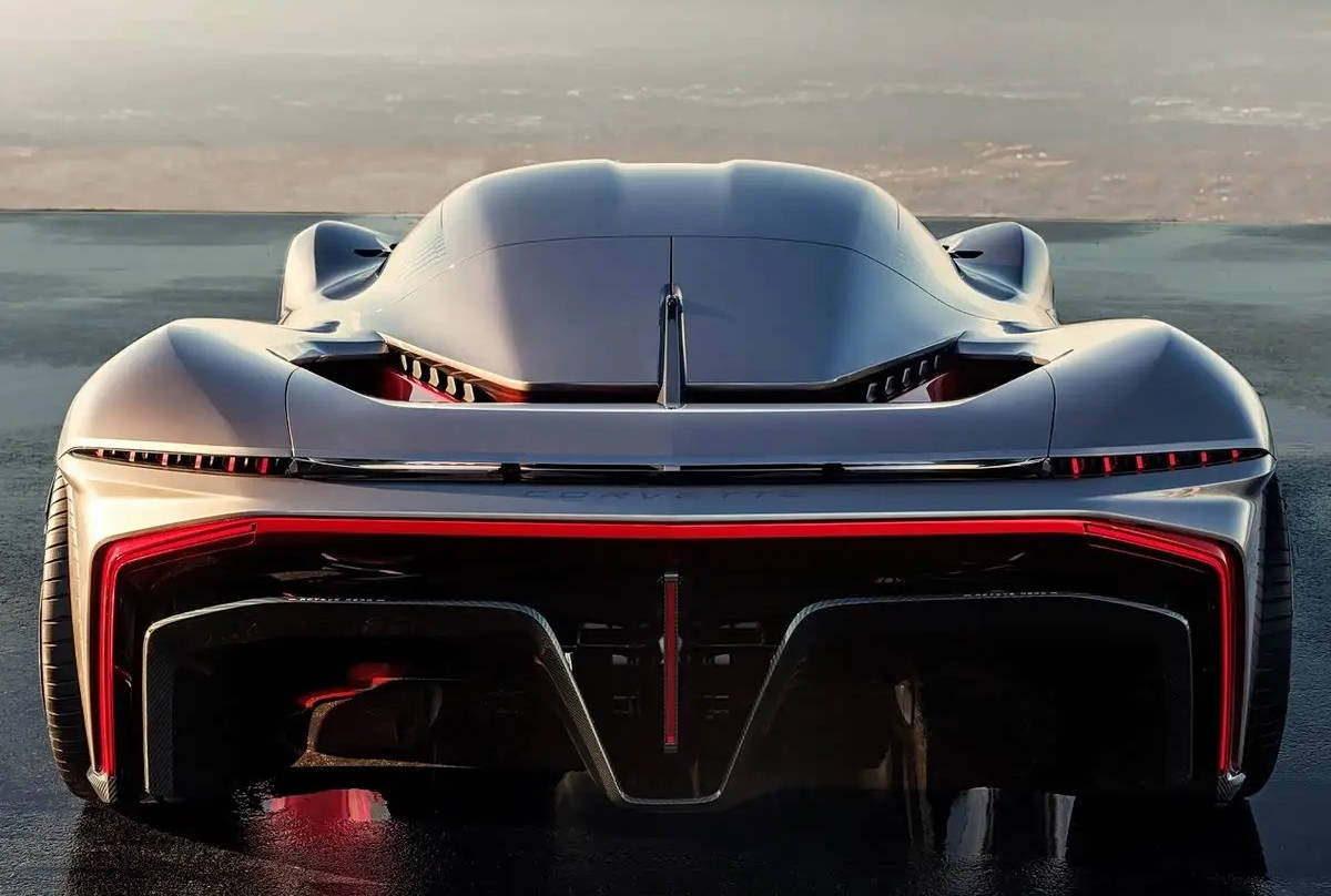 车身侧面的设计也极为夸张,低风阻轮圈配备了单孔中心锁设计,并搭配了前六后四的碳陶纤维制动系统。侧面的通风开口在车体下方与车尾部进行了连通,将空气动力学做到了极致,同时让底盘的设计形成了全新地效风格。此外,新车的机舱打开方式为蚌壳式的前翻设计,未来感属性直接拉满。