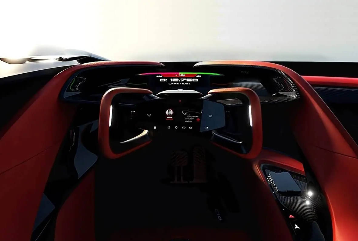 车辆内部则以简约的内饰为基础,一切功能和设计都以驾驶员为中心,整体中控台面集成了紧凑的结构设计并搭配以性能数据为展示重点的全液晶显示屏,同时 车辆还将搭配增强现实HUD,并显示最基本的数据,避免在高速下使驾驶员分心,专注高速驾驶。