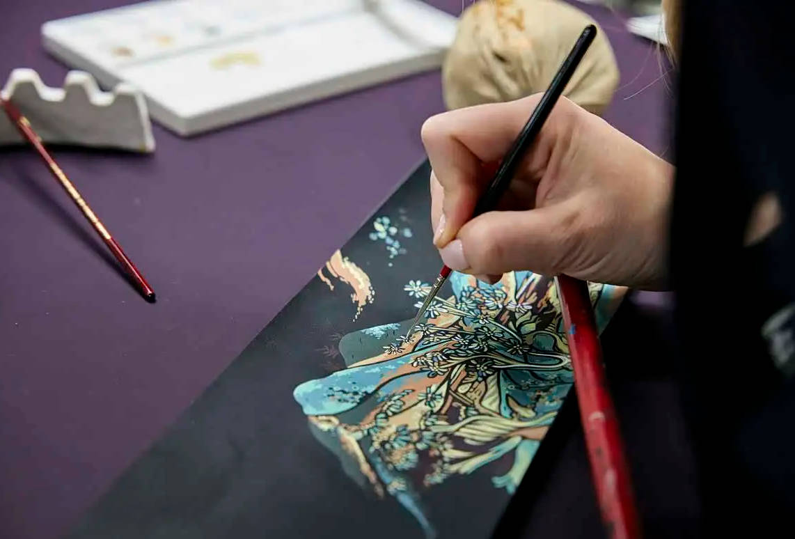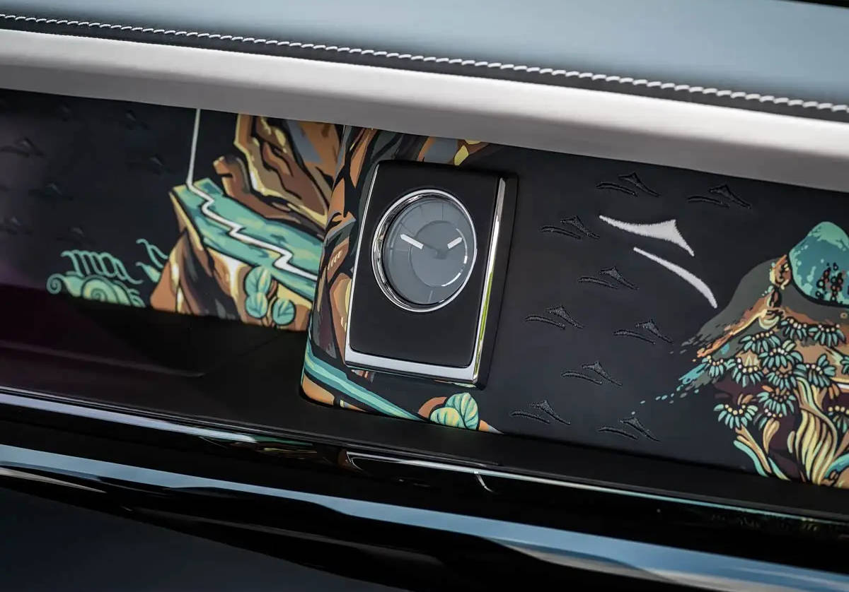 内饰方面,车内配备了手工绘制的定制画作。画作展现了敦煌壁画中飞天神女的景象,采用了中国传统的“减法木刻印刷”技法,每一层画作都通过细腻的画笔逐层渲染,以呈现深度和节奏感。座椅使用了黑色和喀什米尔灰色皮革,前后车门则采用了不同色调的Canadel木饰板。后门面板内嵌“不朽的丝绸”图案,象征着敦煌壁画中的艺术元素。
