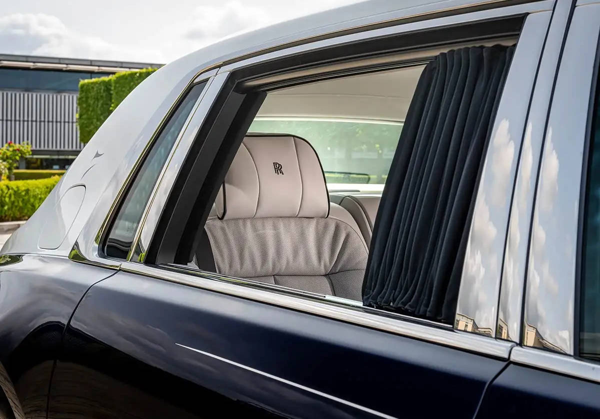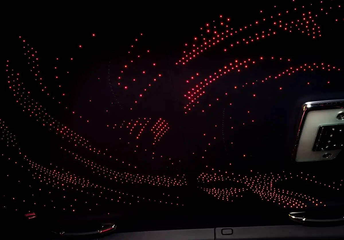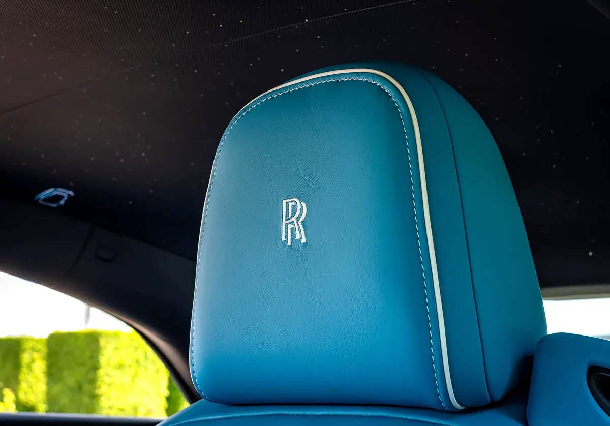 座椅采用绿松石色和黑色皮革搭配,后排座椅则为黑色,配有对比鲜明的白色缝线。车内的丝绸之魂图案被镶嵌在绿松石色的照明踏板上,此外,车门和定制星空头顶内饰也通过1,344颗星光与192颗流星为乘客带来独特的光影效果。