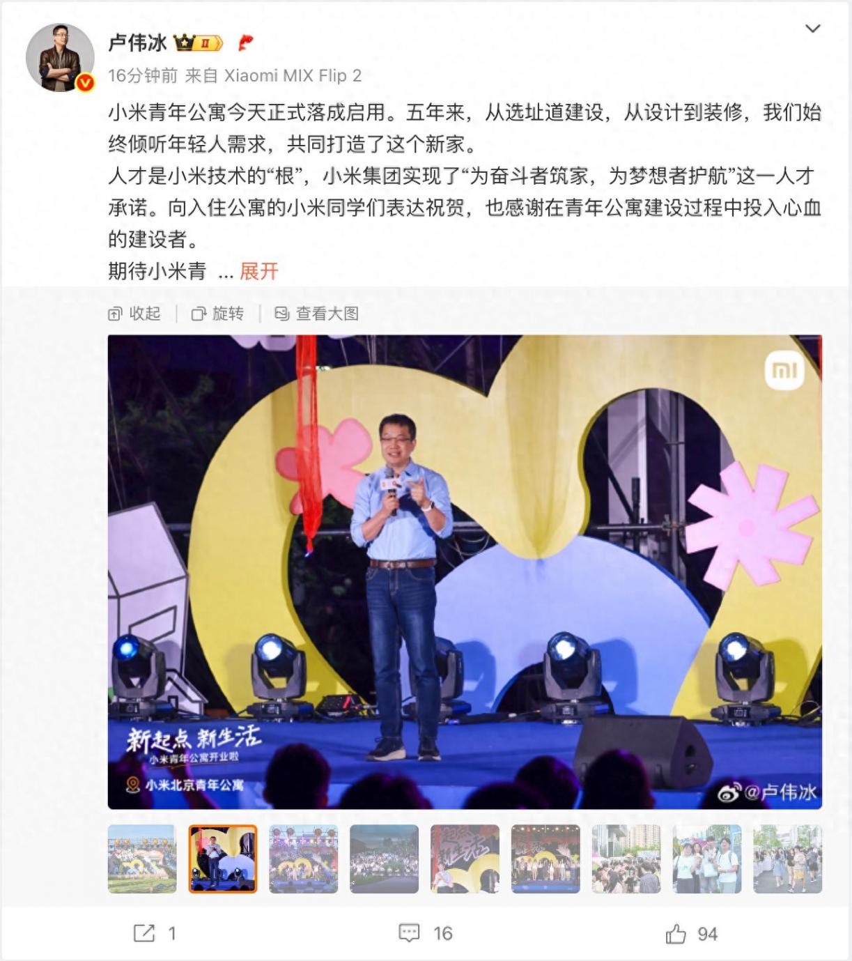 7 月 30 日消息,小米集团合伙人、总裁,手机部总裁,小米品牌总经理 @卢伟冰 宣布,小米青年公寓今天正式落成启用。