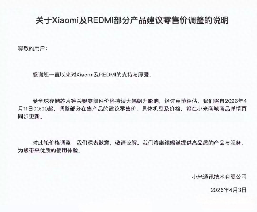 4月3日,小米官方发公告了一个不太让人开心的消息:从4月11日零点开始,小米部分手机要涨价了!这次涨价主要是因为全球存储芯片价格飙升,成本压力太大,小米不得不调整售价来保证产品供应和品质。