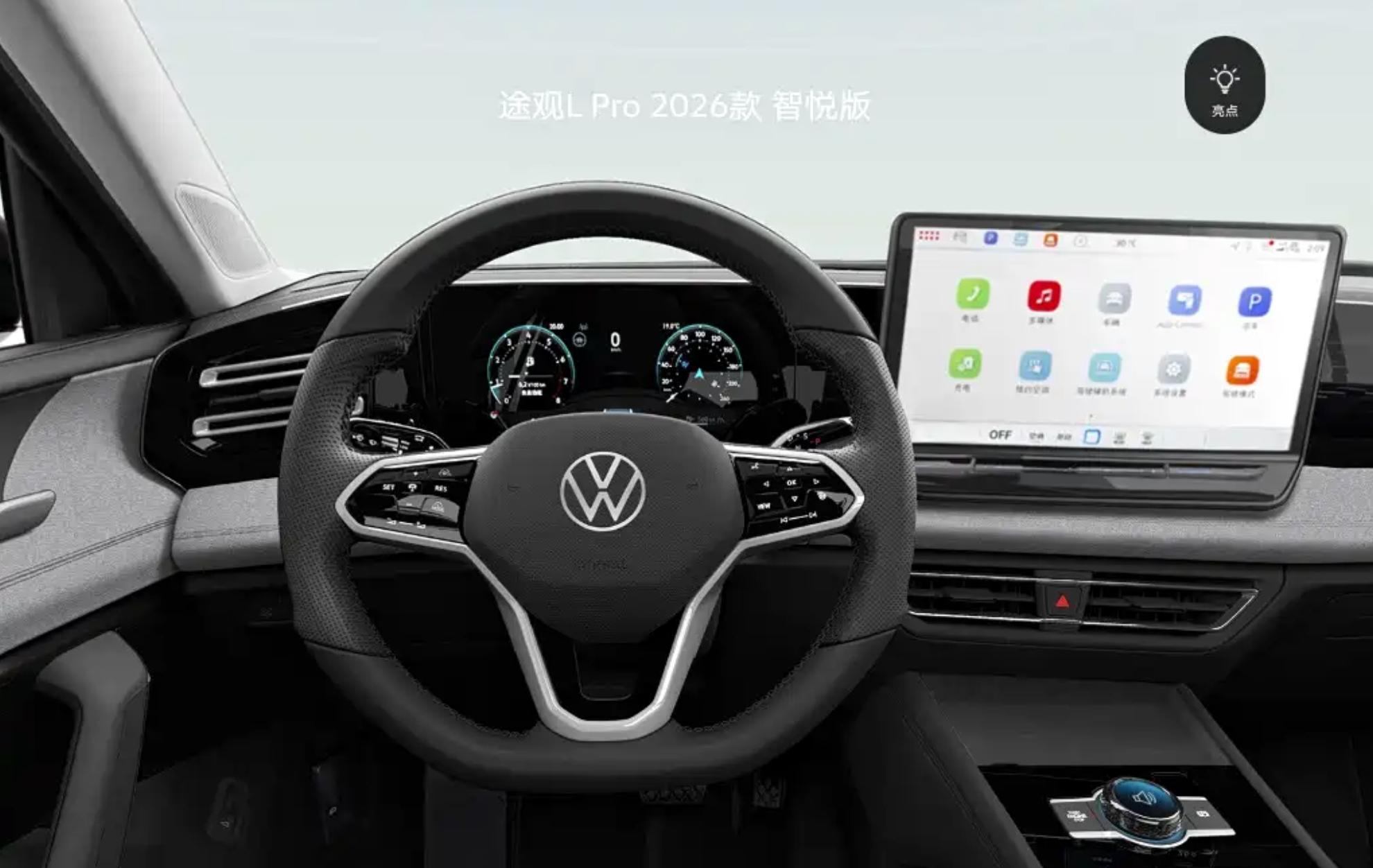进入车内,途观L PRO采用了大面积仿皮座椅,耐磨易清洁,适合日常家用,还在门板四周加入了皮/翻毛皮(Alcantara)混搭,提升侧向支撑力与触感细腻度,兼顾冬季保暖与夏季透气,车顶和地毯也都加入了植绒面料,并在扶手箱、门板等触手可及处采用绒面或绒布包裹,增强温润质感。大量钢琴烤漆饰板、金属饰条的加入,提升豪华感,但却成为了指纹收纳器。各部件间隙均匀一致,体现德系车严谨的装配标准。中控台配备了皮革包裹的多功能方向盘,配备12.9英寸中控触摸屏,配备5扬声器,配备自动空调,副驾座椅10向电动可调,支持无线Carplay/Hi-Car等终端互联等配置;该车不配备ID.Drive辅助驾驶管家,仅配备3个毫米波雷达、2个摄像头、8个超声波雷达。