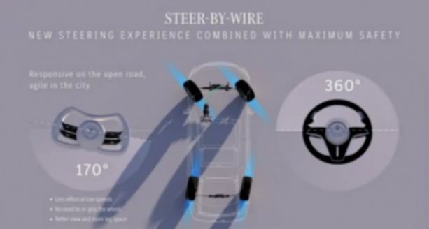 奔驰这款方向盘上下两侧采用弧形设计,减小视线遮挡,甚至为适配它重新研发了气囊。更重要的是,新车同步引入线控转向技术,彻底取消方向盘与转向机构之间的机械连接,驾驶者只需小幅转动方向盘即可完成大角度转弯,低速更灵敏、高速更沉稳。