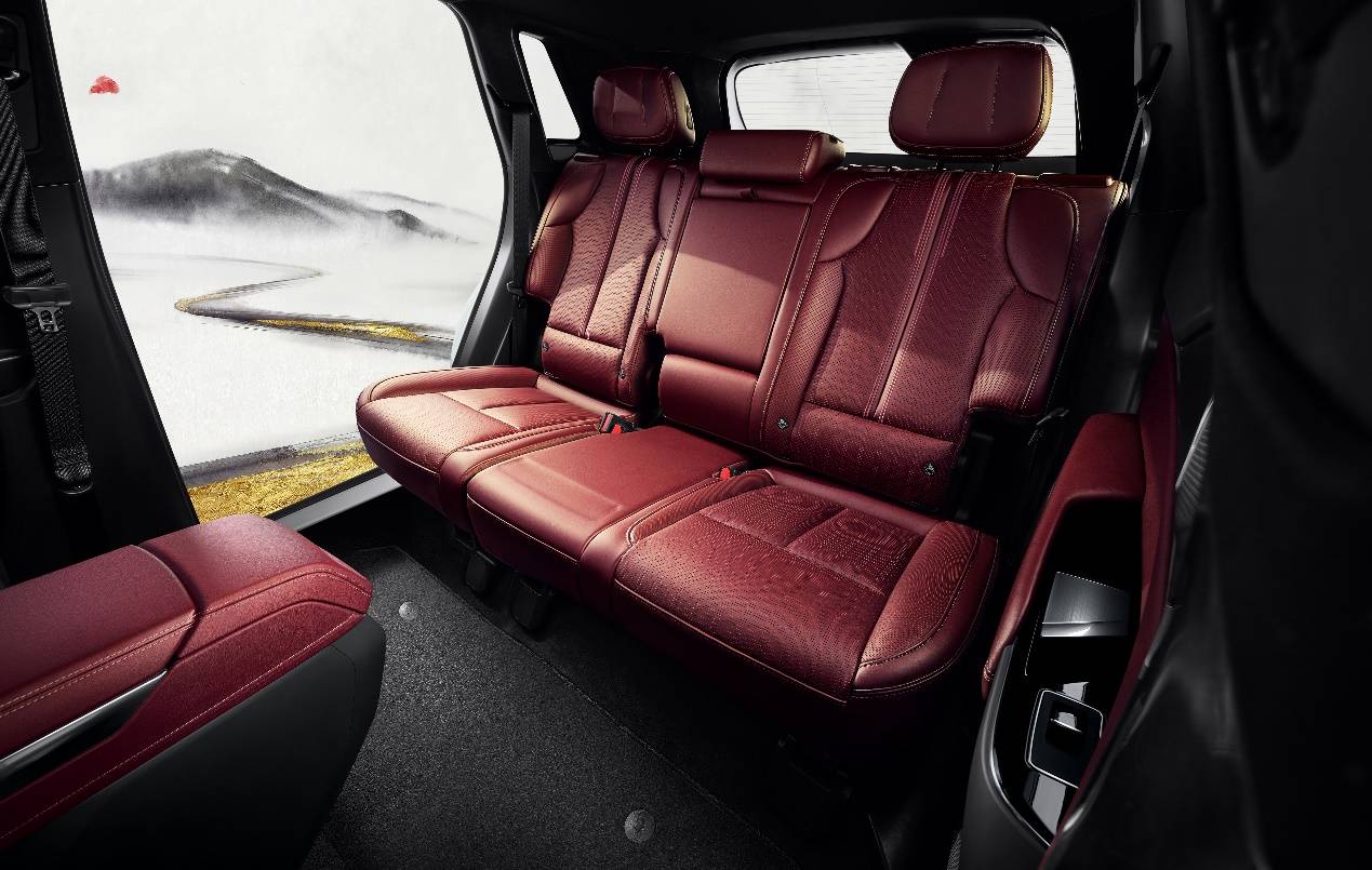 在豪华配置方面,XT5全系标配33英寸9K环幕式超视网膜屏,分辨率达9K,像素密度271PPI,屏幕边缘采用2.5D圆角工艺,背面有品牌LOGO迎宾灯。即将上线的OTA V6.0系统将引入高德地图车机版,新增顺路搜、绿灯倒计时、路口大图显示等功能,并对运动模式仪表盘增加转速表、机油温度等核心参数显示。音响系统采用AKG录音棚级音响,配备15个扬声器、10通道功放,功率1kW,并标配ANC主动降噪技术。座椅方面,前排座椅支持三挡加热、通风及按摩功能,后排座椅支持加热及一键电动放倒,后排地板为纯平设计,行李箱容积653L,放倒第二排后可达1,589L。内饰材料采用Fine Nappa半苯胺真皮、真铝和真木饰板,其中铝材经6道微压纹理工艺,木材采用超轻薄开放式表面处理工艺。