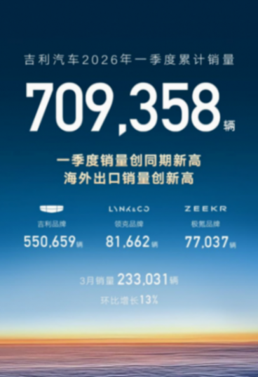 2026年一季度,吉利汽车累计销量709,358辆,强势登顶中国汽车自主品牌销量冠军,其中3月单月销量233,031辆,环比劲增13%。更具里程碑意义的是,集团新能源销量达369,059辆,占比首次突破52%,标志着吉利正式迈入“新能源为主、燃油协同”的高质量发展新周期。