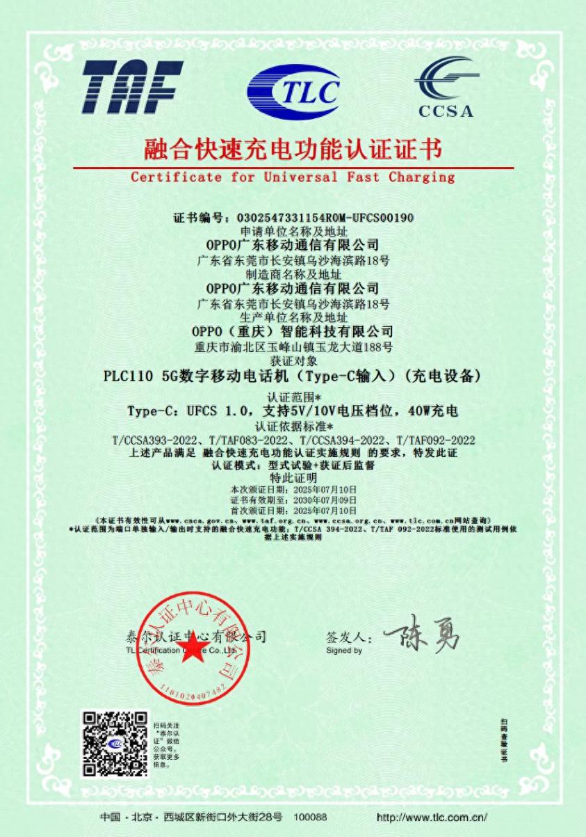终端快充行业协会副理事长单位OPPO旗下一加 Ace 5至尊版手机成功通过融合快速充电功能认证,获得行业首张 40W UFCS 融合快充认证证书,认证编号为