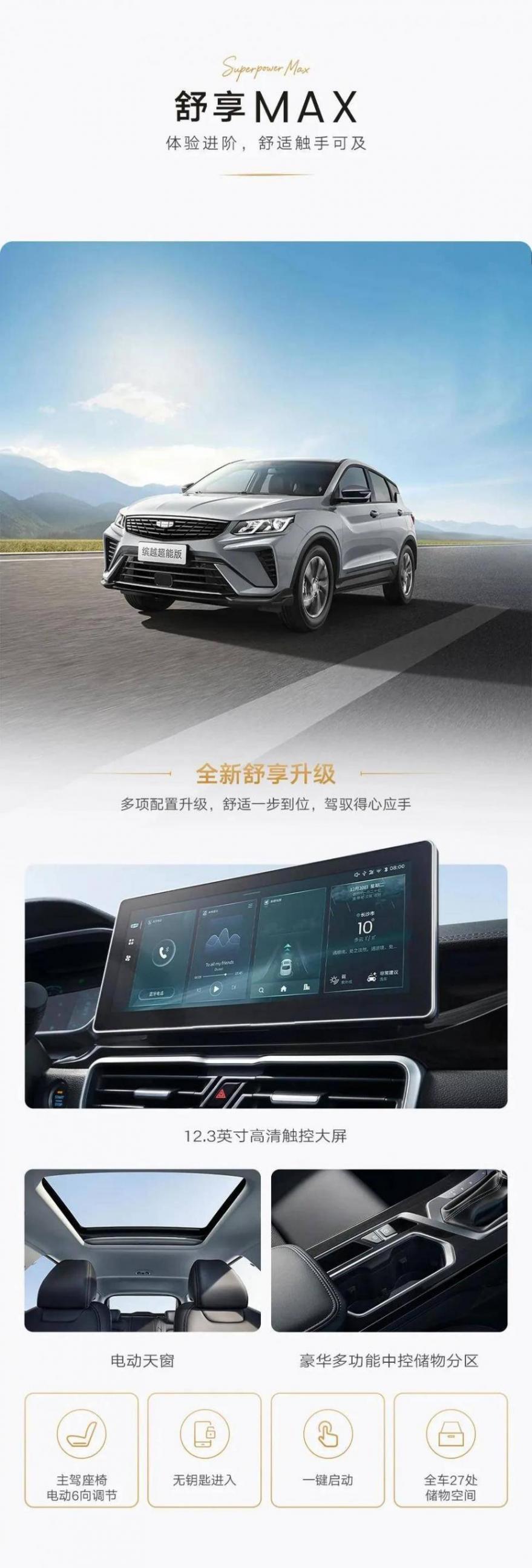 7月16日,吉利缤越超能MAX版车型正式上市,这款车型是吉利缤越超能版的新增配置。作为顶配版本,新车进行了部分升级优化,限时先享价7.18万元。